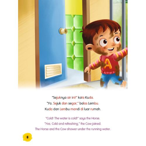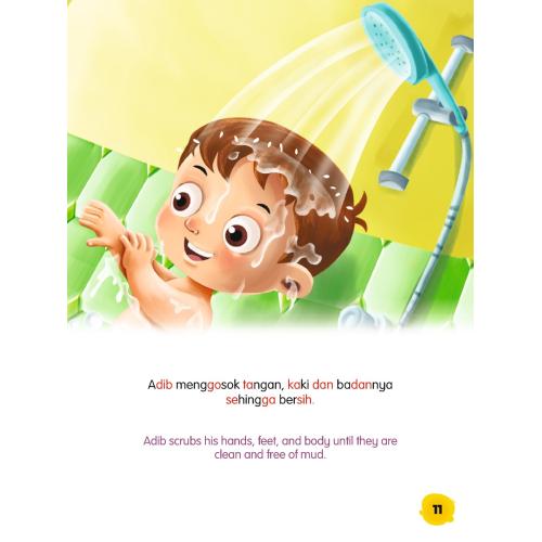 Adib bersama Lembu dan Kuda bermain lumpur. Badan mereka kotor. Lembu dan Kuda mandi di luar manakala Adib mandi di dalam bilik air. Adib mandi sendiri dan mengingat kembali apa yang diajari oleh ibu.