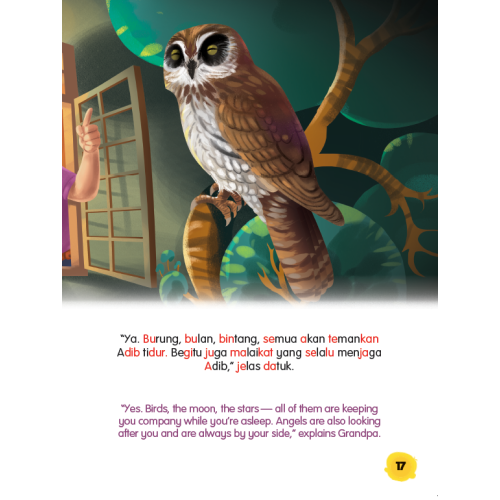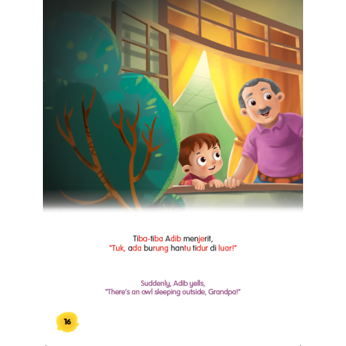 Adib bermalam di rumah datuknya. Datuk menyuruh Adib tidur seorang diri. Adib berasa takut. Tiba-tiba Adib terdengar bunyi sesuatu. Rupa-rupanya bunyi itu adalah bunyi dahan pokok. Akhirnya Adib tidur dengan lena.